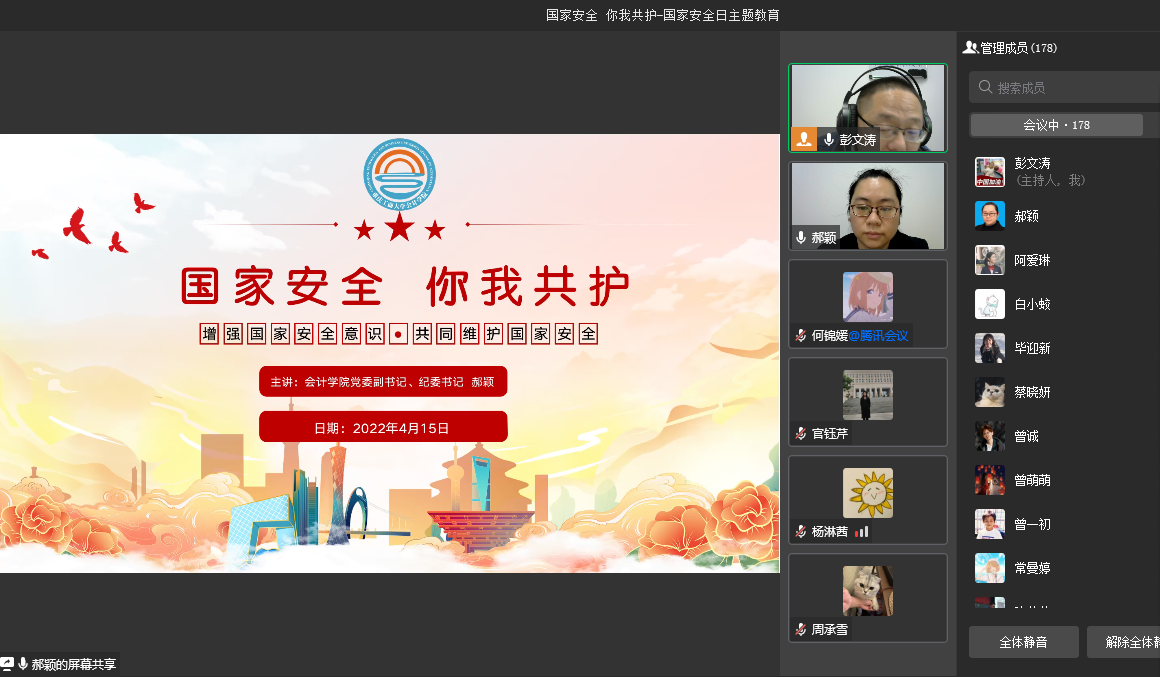 4月15日14:20,必赢766net手机版在线上开展了“国家安全 你我共护”主题党课。我院党委副书记、纪委书记郝颖主讲,必赢766net手机版全体本硕学生党员、各学生组织代表、团支书班长代表200余人参加;郝颖从中国面临着对外维护国家主权、安全、发展利益,对内维护政治安全和社会稳定的双重压力两方面入手,讲解了国家安全日的由来和国家总体安全观,以案例讲解了危害国家的五种安全行为,重点介绍了如何维护国家安全,做到国家安全、你我共护。