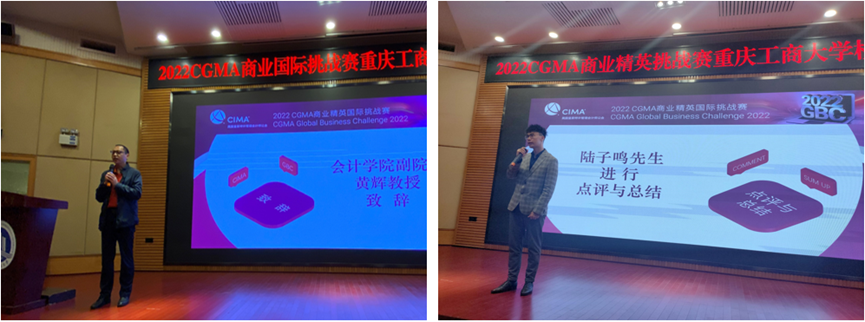 在比赛正式开始之前,黄辉副院长进行了致辞。他首先代表学院对各位嘉宾的到来表示欢迎,对各位评委及赛事组织者表示感谢。黄院长指出,今年是我校建校七十周年,也是我校CIMA国际项目成立十周年,感谢CIMA公会的信任,2022CGMA商业精英国际挑战赛的全国赛及北亚极限赛将由我校承办。黄院也寄语同学们通过比赛培养自己的专业能力,努力成为国际化的高精尖人才,并鼓励本次比赛各参赛选手“赛出工商风采,成就更好自我”,预祝本次比赛圆满成功。