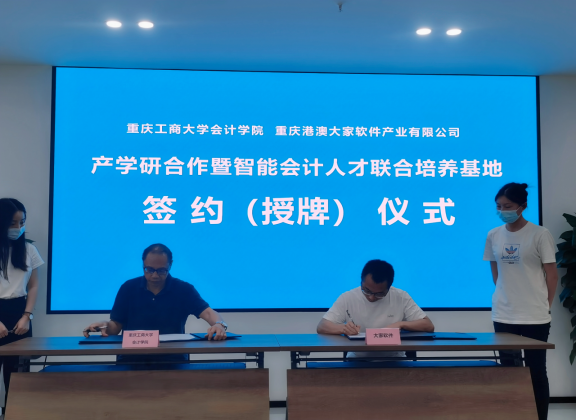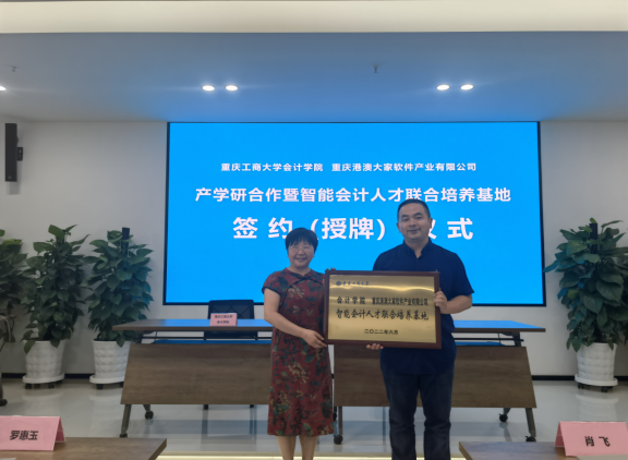 在与会嘉宾的见证下,由黄辉副院长和蒲永波总监分别代表重庆工商大学与重庆港澳大家软件产业有限公司签署并交换了校企合作协议,罗惠玉书记代表重庆工商大学向重庆港澳大家软件产业有限公司授予“必赢766net手机版智能会计人才联合培养基地”的牌匾,肖飞总经理欣然接受,与会嘉宾热烈祝贺。