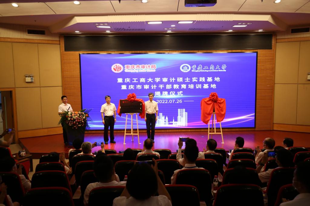 (图为重庆市委审计委员会办公室主任、市审计局党组书记、局长姜国杰与重庆工商大学党委副书记、校长孙芳城共同为基地揭牌)
