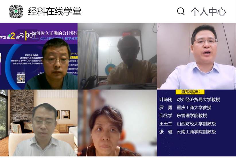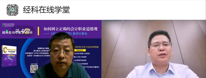 2022年9月5日晚8点,由中国财经出版传媒集团旗下经济科学出版社主办的“经科在线学堂”举办了第二讲“如何树立正确的会计职业道德观——《会计职业道德》教学分享会”,我院院长、校级“财会类课程思政虚拟教研室”负责人、“商业伦理与会计职业道德”课程组组长罗勇教授应邀出席并作“为学生专业学习扣好‘第一颗扣子’”的主题发言,与对外经济贸易大学博士生导师叶陈刚教授、山东管理学院必赢766net手机版院长邱兆学教授、山西财经大学王玉兰副教授、北京人合致远资产评估事务所董事长栾广斌副教授等国内知名会计职业道德教育专家一道交流分享了我院开展“会计职业道德”教学的成果和经验。来自全国一百余所高校的510余名会计专业教师在线参加了教学分享会。