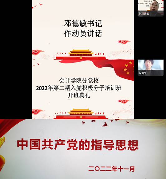 11月18日,举行了培训班开班典礼,我院党委书记邓德敏、专职组织员尹建平、副书记郝颖出席典礼。邓书记在讲话中阐释了培训班的意义,鼓励同学们学好党的理论知识,躬行实践积蓄力量,为国家发展做出自己的贡献。集中授课部分有六讲,主题分别是习近平新时代中国特色社会主义思想与中华民族伟大复兴、中国共产党的组织原则和纪律、学习宣传贯彻党的二十大精神、中国共产党的指导思想、中国共产党的性质、宗旨、纲领和现阶段的任务及统战知识、中国共产党党员。集中授课让同学们全面系统地学习了党的基本知识和重要理论。自学部分,则是学习党的二十大报告,分党校还对优秀报告进行了评奖表彰。