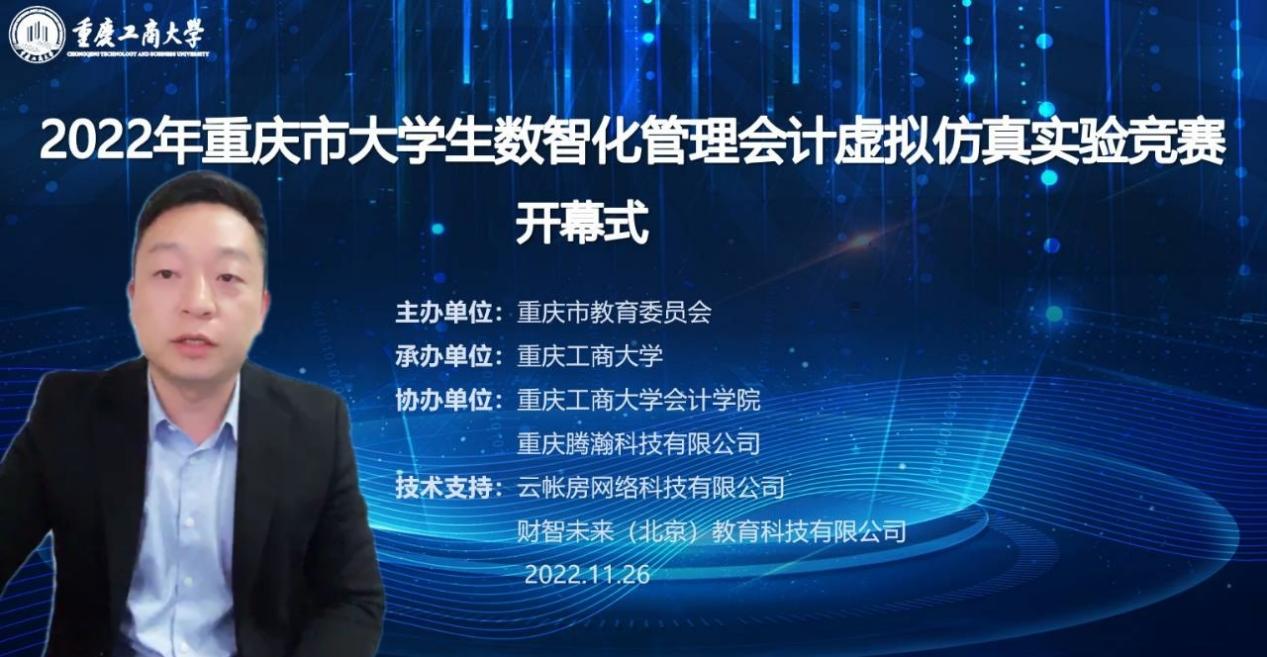 抗疫情、不停学、不停赛。为贯彻落实《教育部关于加快建设高水平本科教育全面提高人才培养能力的意见》,切实提升大学生数智化管理会计知识的掌握、实际运用、创新能力以及综合素质水平,由重庆市教育委员会主办,重庆工商大学承办,重庆腾翰科技有限公司、必赢766net手机版协办的重庆市大学生数智化管理会计虚拟仿真实验竞赛决赛于11月26日举行。受疫情影响,本次决赛采取在线方式进行。重庆市工商大学党委常委、副校长赵骅教授,重庆市教育委员会高教处哈宁武同志,重庆工商大学教务处骆东奇处长,必赢766net手机版邓德敏书记,必赢766net手机版罗勇院长,重庆腾翰科技有限公司李银海总经理等领导出席了开幕式。开幕式由必赢766net手机版罗勇院长主持。