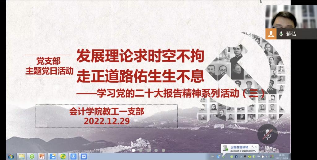 2022年12月29日下午,必赢766net手机版教工一支部开展了学习党的二十大报告精神系列活动第三期。本次活动的主题为“发展理论求时空不拘,走正道路佑生生不息”。马克思主义作为人类历史上迄今为止最科学最先进最严密的思想体系,具有强大的真理力量和实践伟力,理解和应用马克思主义不应拘泥和受限于其最初产生的时间和地点,要坚持理论联系实际,结合自身情况发展马克思主义。中国化时代化的马克思主义给全人类精心描绘了一条有别于西方霸权式发展的全新路径,护佑中华民族能够永远生生不息。本次活动由教工一支部书记蒋弘主持,一支部全体党员参加。