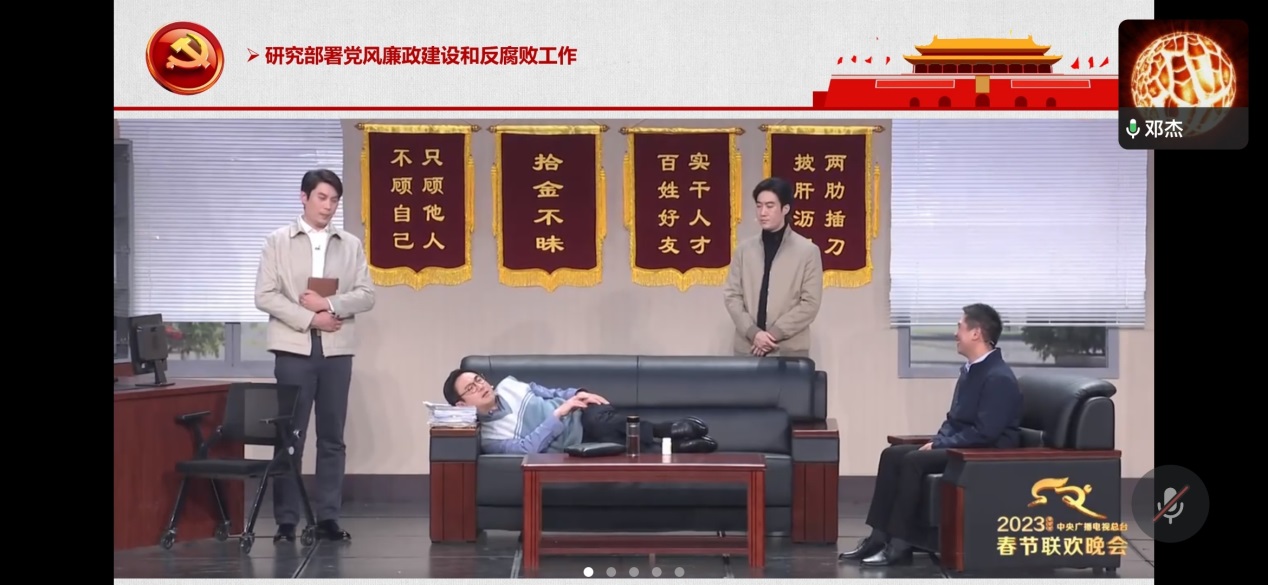活动首先是由统战委员邓杰领学“中共中央政治局2022年12月6日会议精神:分析研究2023年经济工作,研究部署党风廉政建设和反腐败工作”。本次会议强调要加强党对经济工作的全面领导,坚持真抓实干,激发全社会干事创业活力,要牢牢把握全面贯彻落实党的二十大精神这条主线,持之以恒加固中央八项规定堤坝,加强纪律建设,以彻底自我革命精神打好反腐败斗争攻坚战持久战。邓杰指出,从此次会议精神可以充分看出我党在反腐道路上“得罪千百人,不负十四亿”的决心、“刀刃向内,刮骨疗毒”的意志,以及坚决打赢反腐败斗争攻坚战持久战的信念。邓杰不仅举例说明了我国经济发展给国家整体实力带来的全面提升,还结合当下热点事件讲述了共产党员保持廉洁奉公、勤政为民本色的重要性。