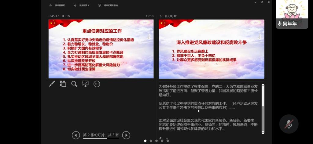 随后,宣传委员吴年年针对领学内容发表了学习感想。她指出,“两个确立”为我国做好各项工作提供了根本保障;党的二十大为党和国家事业发展指明了前进方向、凝聚了奋进力量;作风建设永远在路上,我们党通过实际行动让人民群众更多地感受到了反腐倡廉的实际成果。