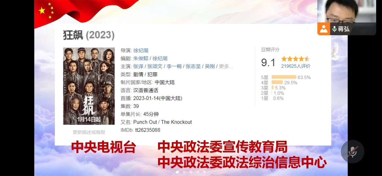 在接下来的“好…好…学习”专栏,支部书记蒋弘给大家推荐了热播国产电视剧《狂飙》。该剧主要讲述了刑警安欣与黑恶势力及其保护伞长达20年的正邪较量。该剧扎根时代,以真实案件为原型,勇于宣扬正义,深刻透视了基层扫黑除恶的艰辛和不易,能够让观众感受到我党将扫黑除恶斗争常态化的坚如磐石、无可动摇的意志和决心。蒋弘借用了剧中一句话与党员同志共勉:如果遇见困难就缩头的话,那就不是一个合格的共产党员。
