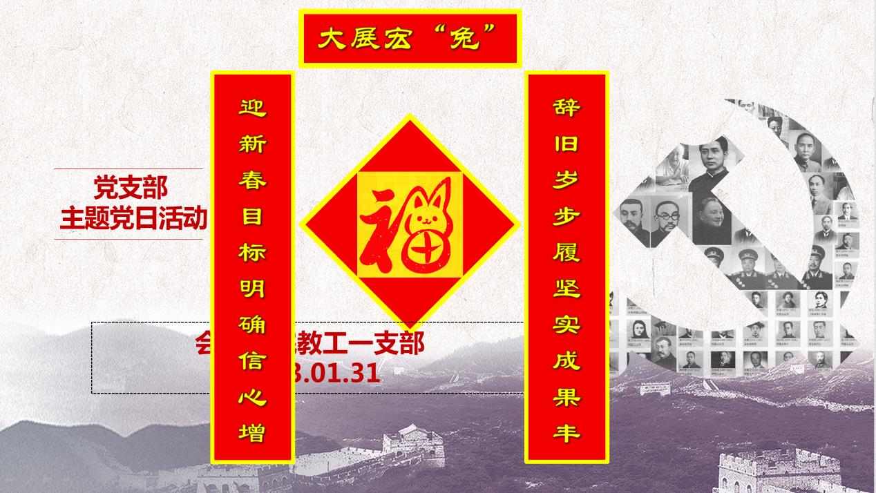 2023年是全面贯彻党的二十大精神的开局之年,进一步做好今年必赢766net手机版教工一支部的党建工作具有重要的意义。1月31日正处于学校放寒假期间,教工一支部支委会仍然带领党员同志,坚持开展主题党日活动。本次活动通过企业微信召开,教工一支部全体党员参加。活动开始之前,支部书记蒋弘送给大家一副春联:上联“辞旧岁步履坚实成果丰”,下联“迎新春目标明确信心增”,横批“大展宏‘兔’”,而这副春联就成为了本次活动的主题。