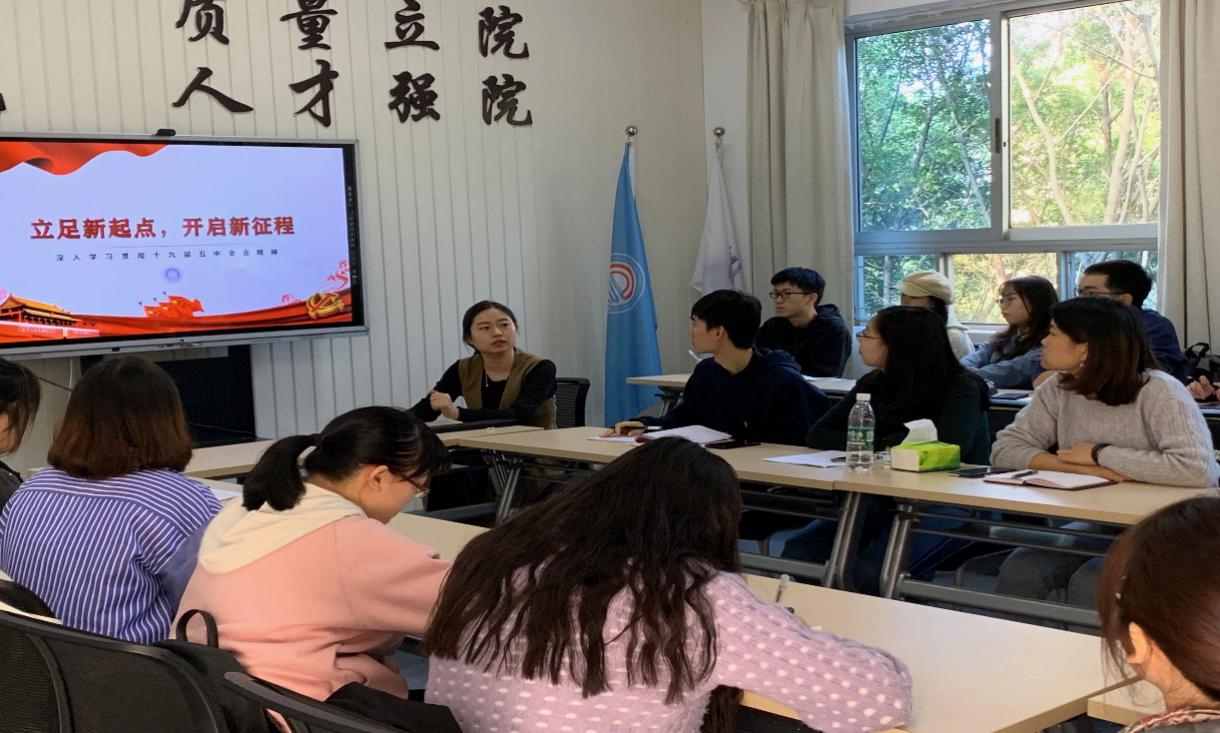 先学一步,深学精髓,领学示范。由党支部书记及支委同志们率先学习十九届五中全会精神,研究琢磨十九届五中全会的内涵要义,确保十九届五中全会精神的新运用新方向。党支部采取集中学习、研讨交流等形式,以书记及支委的表率带头作用促进党支部同志们的学习热潮。党支部书记王婷及支委邓灵林在会上带领支部同志们学习十九届五中全会的精神及基本知识,并指出青年党员要在学习和生活中,认真的学思践悟十九届五中全会精神。