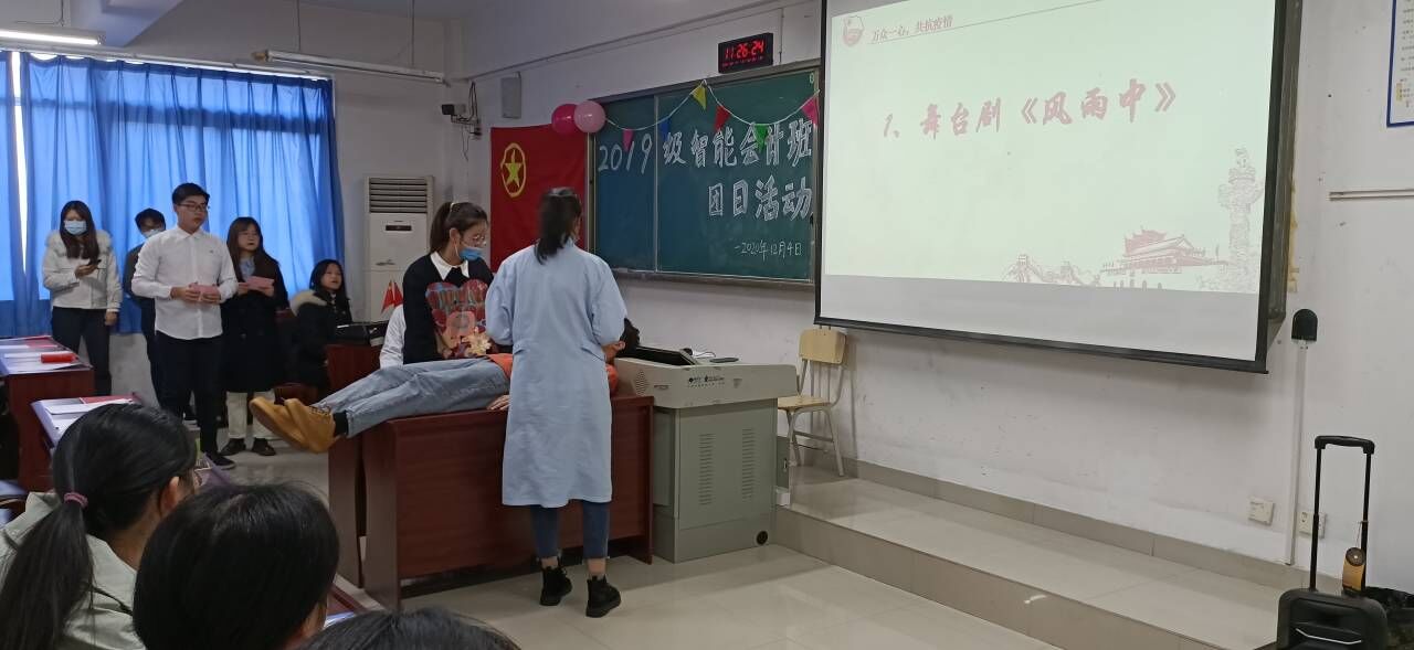此次活动以新冠疫情发展为时间线,分“武汉告急,千钧一发”“万众一心,共抗疫情”“开怀畅谈,展望未来”三个章节展开。活动在全体同学高亢的团歌声中拉开帷幕。主持人以疫初回顾为起点带领同学重温了抗疫这场没有硝烟的战斗。第一章节,梅婕、彭珂两位来自武汉的同学分享疫情经历,让同学们从中体会疫情初期武汉疫情防控的严峻形势。接着,通过抗疫知识竞赛,回顾了抗疫相关科学知识,提高了同学们的安全防疫意识。第二章节,全体同学观看由班级成员带来的舞台剧《风雨中》,从一个平凡的医务工作者的身上感受中国人民凝聚的伟大抗疫精神。舞台剧结束,班级同学积极分享从舞台剧中得到的感悟以及疫情期间发生在身边的抗疫故事,每个人都在这场战斗中默默贡献着自己的一份力量。接着由曹刚、潘棋君等六名同学带来的朗诵《我们一定会赢》将活动推向高潮,激情又充满感染力的朗诵深深打动了现场的同学,彰显了工商学子激昂的斗志和必胜的决心,赢得了现场热烈的掌声。接下来通过由图片和文字的提示回忆抗疫英雄的活动,让同学们回顾了疫情期间钟南山院士、李兰娟院士等英雄人物的先进事迹,从一个个关键词中感受英雄的可贵品质,在潜移默化中增强家国情怀和民族自豪感。活动中,未能到场的我院党委书记罗惠玉书记、抗疫一线的医务工作者也通过录制视频的形式为班级同学提出了继续弘扬抗疫精神的希冀和建议,发人深省。第三章节,班级同学结合自身专业讨论疫情对会计人的影响,讨论成果为今后的学习和生活明确了方向、坚定了目标。随后,大家一起观看班级录制的疫情加油视频,表达对疫情期间勇敢战斗的一线人员的感谢,对祖国美好未来的期望,对全球疫情防控的祝福。最后,由邹玥、甘梓琪等四位同学领唱、全体同学合唱歌曲《我和我的祖国》,本次团日活动在同学们悠扬的歌声中、在飘扬的五星红旗见证下圆满结束。
