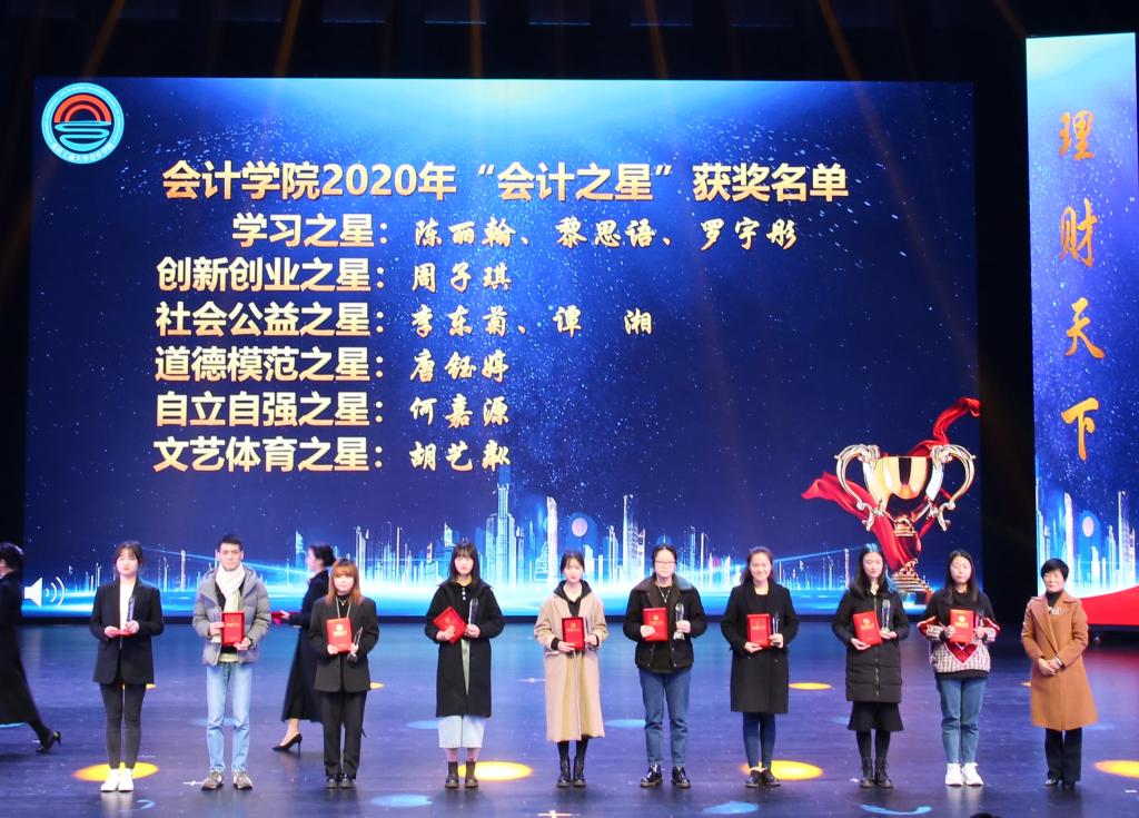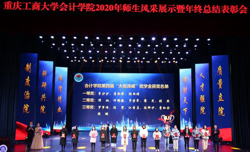 大会还展示了校长荣誉奖、国家奖学金等学生风采,并由2020年重庆工商大学校长荣誉奖获得者刘梦诗作为学生代表发表感言,她表示会不负学院栽培,未来会将“诚信精业”的会计理念持续宣传,做会计学子的榜样;此外,张辅辙先生、徐国富先生还分别对“大信谛威”,“金科控股 星顺”校友奖学金获得者进行了颁奖。在现场观众的阵阵掌声中,表彰会迎来了一波又一波的高潮。