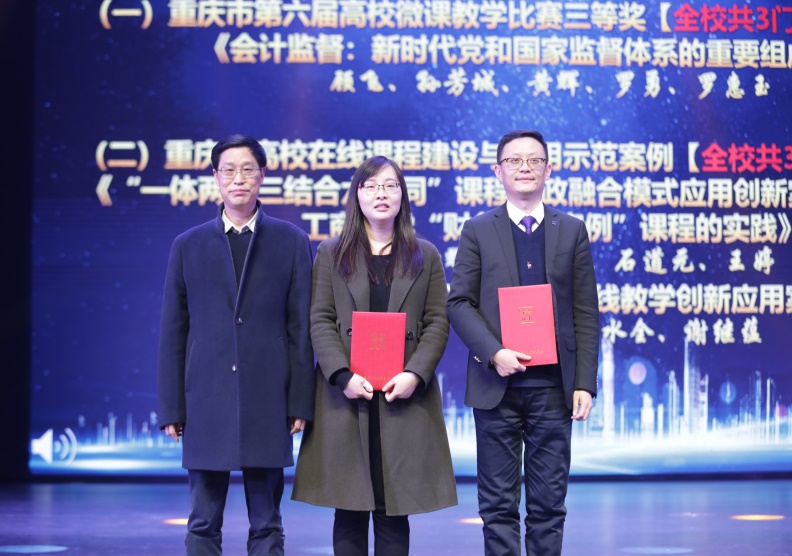 随后,校党委李志雄书记向王婷老师颁发了全国辅导员年度人物的奖牌,校党委宋豫副书记向获评“会计之星”的同学们颁发了奖状和奖杯,陈兴述副校长向顾飞老师和蒋秋菊老师颁发了重庆市第六届高校微课教学比赛三等奖 ,相关职能部门领导为校级以上获奖的教师颁发奖状。