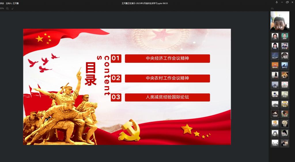 1月11日,支部26名党员参与了线上的讨论学习。会上,王天鹏、蒋成、刘帆三名同志首先领学了中央经济和农村工作会议的会议内容,对其中的会议精神以及未来经济工作和乡村振兴任务等重要指示进行了学习并发表自己的见解和看法。其中刘帆同志谈到自己出生的农村之前因土地问题,很多人难以提升生活质量,但在党和国家的关怀和领导下,大力发展四大怀药种植,土地被集中种四大怀药,每到种植、收获的季节,还能解决一部分的临时就业情况,农民增收,促进了乡村经济的发展。