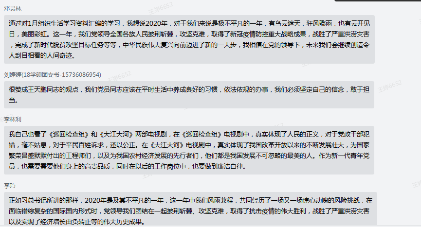 随后,支部同志们展开了线上讨论,李林利、张蕊婷、邓灵林等6名同志在企业微信群发表学习心得。最后,支部书记王婷作会议总结并提醒党员同志们在实习或者放假返乡途中要注意做好个人防护,提高疫情防控意识,另外也激励支部全体党员,继续发挥先锋模范作用,勇敢担当,坚持到底,夺取抗疫胜利。