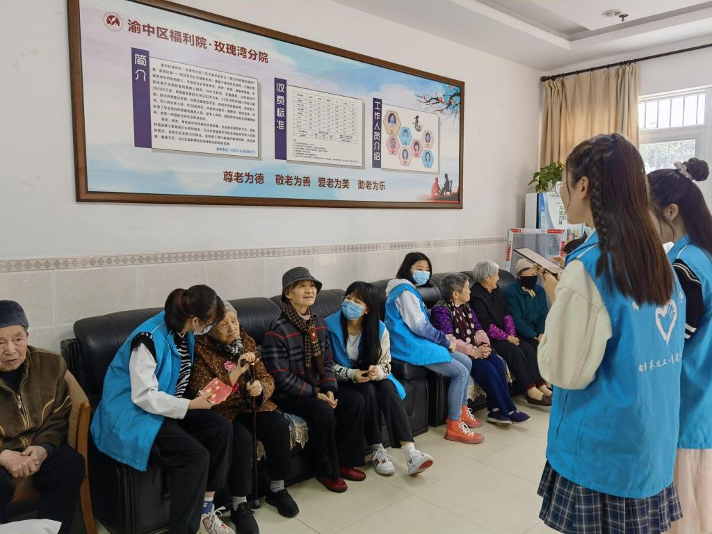 上午8:00,南岸校区与江北校区的志愿者们同时出发,并于9:00准时到达渝中区福利院——玫瑰湾分院。志愿者与老人们亲切问好后,围坐在老人们的身旁,与其聊聊家常、说说暖心话,认真倾听着老人们讲诉着他们的故事。在之后的表演环节中,志愿者们认真展示自己精心准备的才艺节目:一首《我和我的祖国》唱出了祖国的大好河山,却唱不尽中华儿女那沉甸甸的爱国情怀;《祖国啊,我亲爱的祖国》诵出了对祖国的深沉情感。形式各样的表演打动了老人们,得到了他们的一致认可。随后的红色革命知识“趣味互动竞答”环节中,与老人们回顾了党史革命的有关知识,让其相信青年志愿者可以肩负起时代的责任,将祖国建设得更加繁荣昌盛。