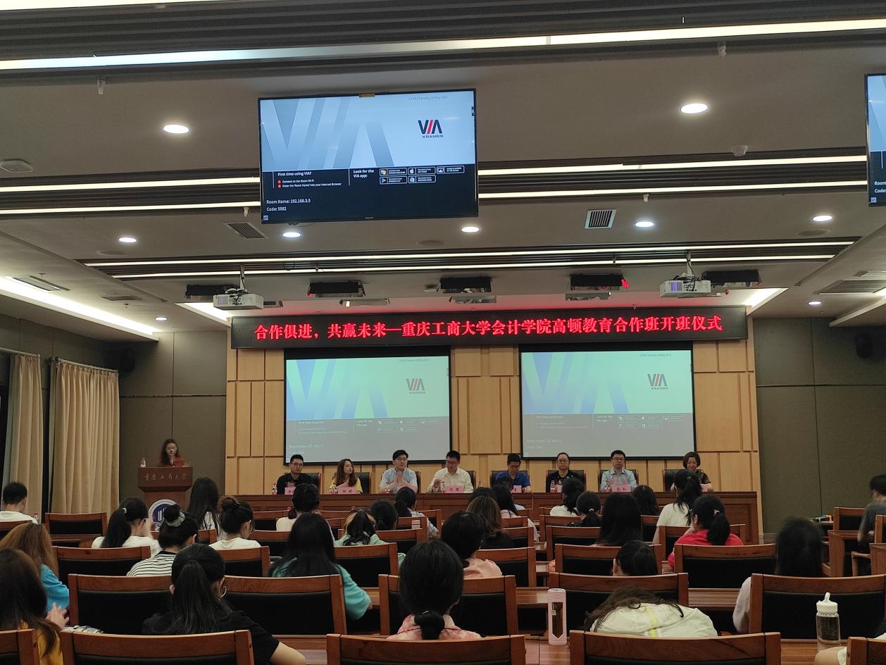 2021年5月18日下午,必赢766net手机版与上海高顿教育股份有限公司冠名合作班开班仪式在校图书馆第一会议室成功举办。出席本次活动的有国信证券重庆分公司总经理助理兼业务管理部总经理陈哲、高顿教育重庆分校校长刘红飞和必赢766net手机版院长罗勇、党委副书记郝颖、会计系系主任蒋弘、合作交流中心主任杜迎新等嘉宾,以及2019级会计学专业一二班全体同学。