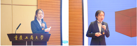随后,由科创先进个人代表高悦洋从“财鑫杯”历史回顾,专业知识类竞赛,创新创业类竞赛,能力拓展类竞赛四个方面进行了分享;财鑫杯获奖团队BRICKS和挑战杯匡琦芳团队依次为在场师生进行了分享;高悦洋同学在演讲台上的表现沉稳自信,一口流利的英文表达让台下的老师同学赞叹不已。