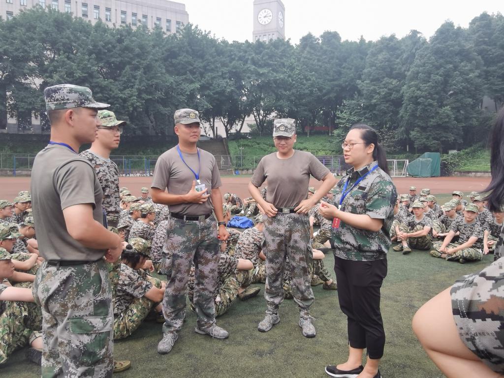 除了完成上述分工,每个老师每天的另一项重要工作就是时刻关注训练场上的同学。教导员和指导员老师每天都到训练场关心同学们的训练进展,并随时准备着应对各种突发状况。尤其偶有同学出现身体不适时,总是老师们第一个前往处理和陪伴。7月11日中午,某连有同学出现身体不适,连指导员老师、助理教官和另外一位同学迅速将其送到南岸区人民医院并全程陪同就医。训练间隙休息时,老师们深入同学中间,聆听同学们的诉求,了解训练进展,询问身体状况,交流训练心得,叮咛训练注意事项,为大家加油鼓劲,共享欢声笑语,真正做到了关怀备至。同时,老师们随时保持与军训师的紧密联系,起到沟通协调作用,让军训工作更合理、更严谨、更安全。