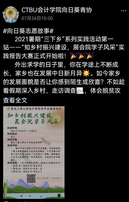 为贯彻习近平主席对乡村振兴讲话:脱贫摘帽不是终点,而是新生活、新奋斗的起点,同时让同学们体会脱贫攻坚落到实处给家乡带来的变迁,领略乡村振兴独特的一面。必赢766net手机版向日葵青年志愿者协会于2021年7月25日至8月10日在线上成功举办了以“知乡村振兴建设,展会院学子风采”为主题的实践报告大赛。