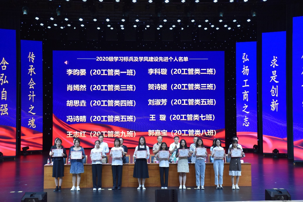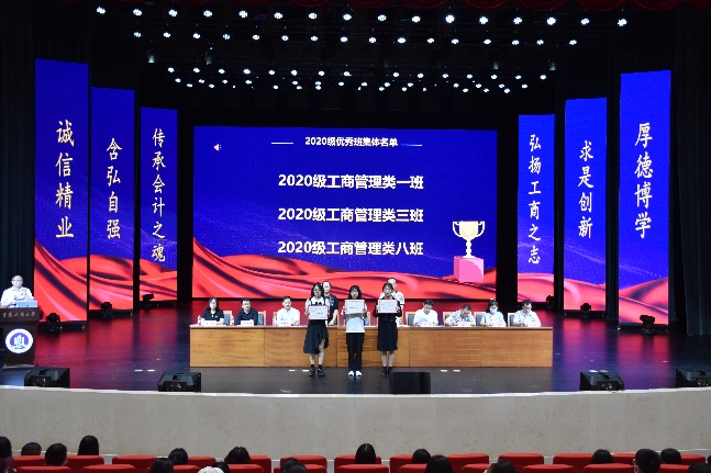 专职组织员石世明宣读《关于表彰2020-2021学年2020级工商管理类专业3个学风建设优秀班集体的决定》并进行颁奖,周兵副院长宣读《关于表彰2020级工商管理类专业学习标兵和学风建设先进个人的决定》并进行颁奖。
