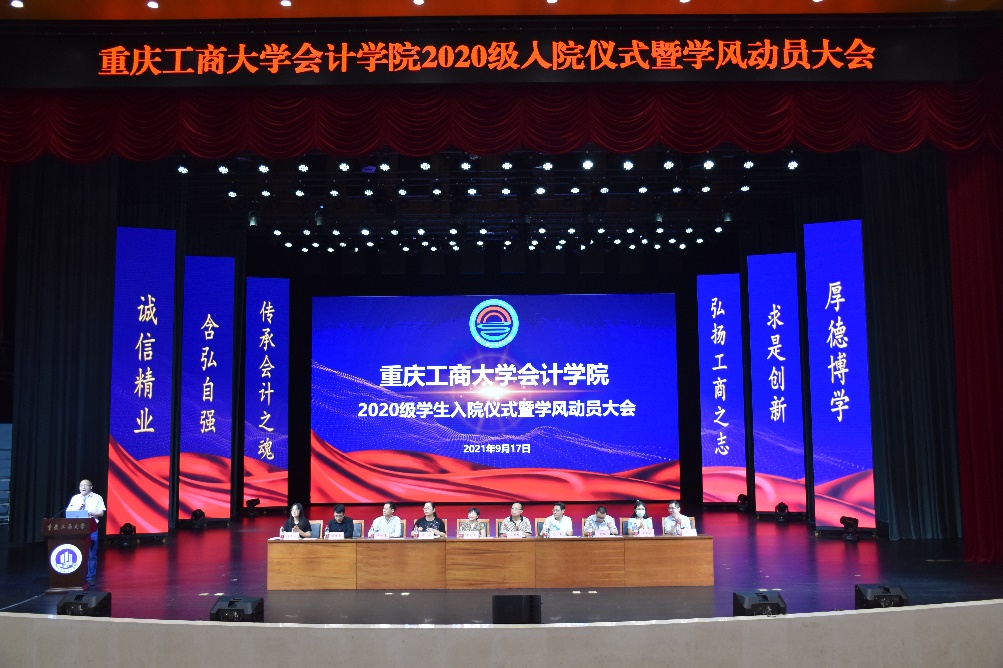 为进一步推动学院学风建设,营造良好育人氛围,增强2020级学生学院认同和专业认同,帮助回归专业学院的学生尽快适应学院学习生活,做好学业规划,2020年9月17日18:30-20:00,我院2020级入院仪式暨学风建设动员大会于南岸校区图书馆大剧场举行。莅临本次大会的有:必赢766net手机版分党委罗惠玉书记、专职组织员石世明、郝颖副书记,周兵副院长、钟廷勇副院长,会计系蒋弘主任、财务管理系蒋水全主任、审计系王杏芬主任、财务管理系唐文秀副主任、综合办刘斌副主任、学工主任彭文涛、2020级带班辅导员王婷、程洁、罗海蓉老师,2020级非国际班全体本科学生参加了本次会议。会议由彭文涛老师主持。