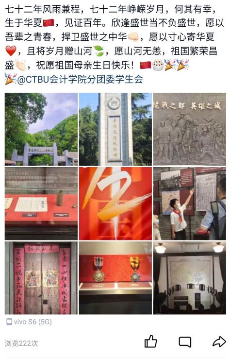 为庆祝中华人民共和国成立七十二周年,激发全院同学的爱国热情,弘扬爱国主义精神,增强时代使命,2021年10月1日,必赢766net手机版分团委学生会、必赢766net手机版向日葵青年志愿者协会、必赢766net手机版党员服务站、必赢766net手机版大学生认知与成长互助社联合承办的“欢庆国庆,祝福祖国”爱国主义宣传活动如期进行,活动采取线下参观实践与线上展示相结合的形式开展,同学们通过实地参观红色革命文化遗迹和与国旗合影的方式,在QQ空间对红色文化遗迹分享参观收获,同时为祖国生日送上祝福。