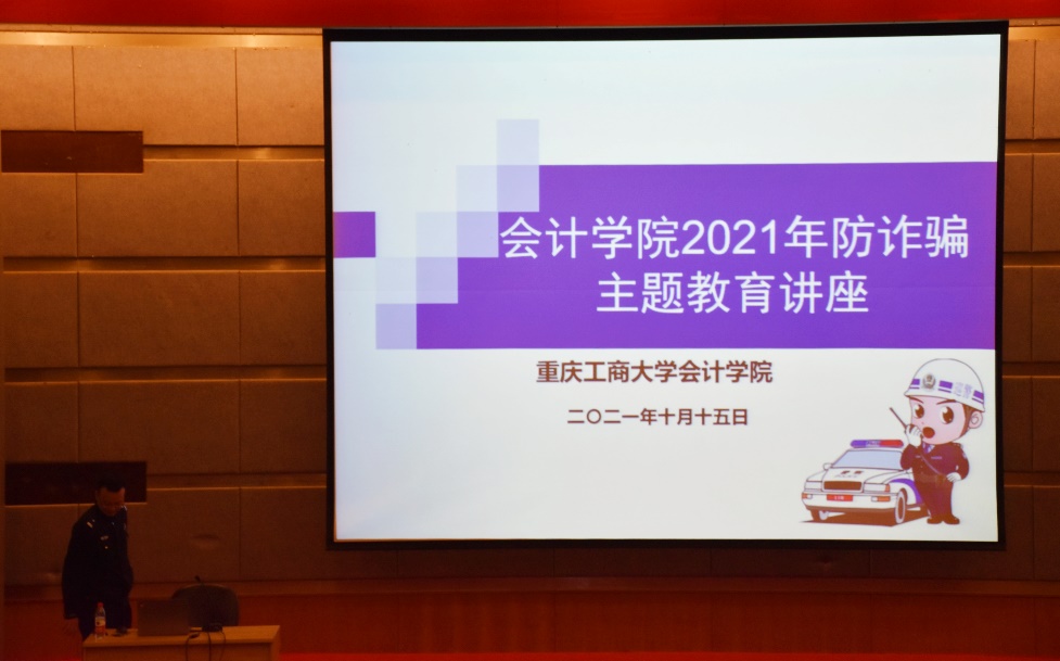 此后,刘国魁警官从什么是通讯网络诈骗及其特点、通讯网络诈骗发案形式、高校发案情况现状和如何防范诈骗案件四个方面为同学们进行了讲解。刘警官结合近几年发生的真实案例,带领同学们观看了骗子冒充公安机关、淘宝工作人员行骗等案例的视频,讲解了常见通讯诈骗方式和应对方法,教导同学们要警惕兼职骗局、保护个人信息,若遇到类似情况要仔细核实、辨别真伪。若不甚被骗,也要及时报警,避免错过追回财物的最佳时机。紧接着,刘警官还通过海棠溪街道一位财务人员被骗的案例警醒必赢766net手机版的同学在以后的工作中,要仔细核实交易人身份,遵守财务制度,不得挪用公款。最后,刘警官提醒同学们要注册并使用好“南岸金钟罩”,安装好“国家反诈骗app”,为同学们财物安全加固了防护罩。
