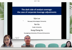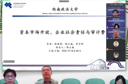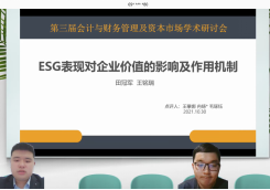 在上半场的学术研讨活动中,中央财经大学博士研究生薛慧丽、新加坡南洋理工大学博士研究生罗思佳、西南政法大学的陈正威和重庆工商大学的王铭瑞随后也相继作了“文本可读性的信息披露效果检验——基于注册制下IPO审核问询的研究”“The dark side of analyst coverage: The case of corporate leverage adjustment”、“资本市场开放、企业社会责任与审计费用”、“ESG 表现对企业价值的影响及作用机制”的学术报告。湖南工商大学朱晓燕、西安交通大学博士研究生朱美乐、西北大学王倩玉和重庆理工大学冉铸对上述学术报告予以了点评。