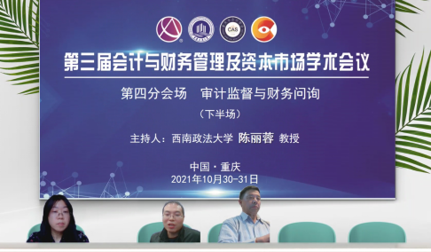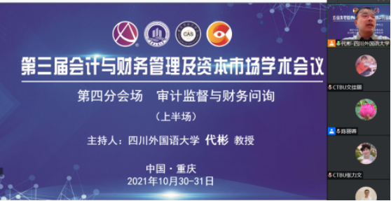 10月30日下午,第三届会计与财务管理及资本市场学术会议第四分会场——审计监督与财务问询在线上成功举行。来自西北大学、新加坡南洋理工大学、西安交通大学、中央财经大学、西南政法大学、湖南工商大学、重庆理工大学、重庆工商大学等高校的学者们相继围绕分论坛主题作了学术报告。《高等学校文科学术文摘》何云峰主编、《西部论坛》杨文举社长应邀担任了分会场的点评专家。四川外国语大学代彬教授、西南政法大学陈丽蓉教授分别主持了分会场的上半场和下半场的学术研讨活动。