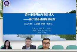 在下半场的学术研讨活动中,湖南工商大学朱晓燕、西北大学王倩玉、重庆理工大学冉铸分别作了“年报柔性监管与股价崩盘风险——基于年报问询函语调的研究”“审计师能否感知到政治不确定性?——来自市委书记变更的证据”和“资本市场开放与审计投入——基于陆港通的经验证据”的学术报告。中央财经大学博士研究生薛慧丽、西南政法大学陈正威重庆工商大学的王铭瑞对上述学术报告予以了点评。