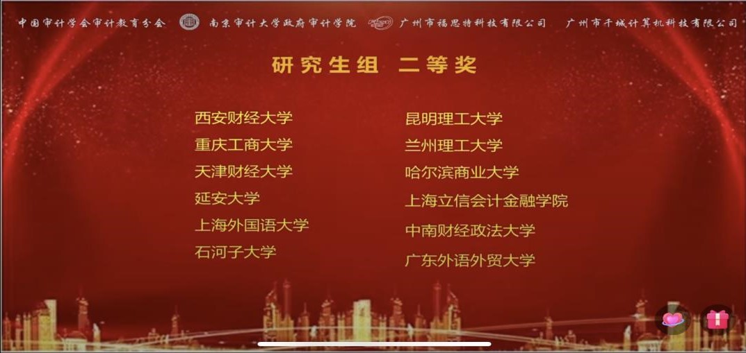 在各级领导大力支持、指导教师石恒贵、李晓羽和王杏芬等的悉心指导下,经过奋力拼搏,必赢766net手机版2019级李昌平、谢媛、周莹组成的本科代表队和2021级审计专硕徐佳豪、周涵非、邓帆组成的研究生代表队,从300多支队伍中脱颖而出,双双斩获全国二等奖。