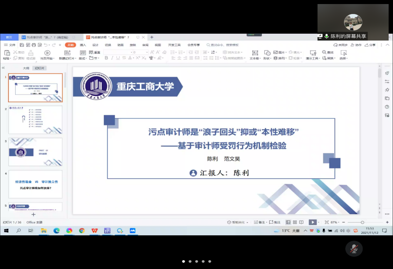 会议第二阶段是论文研讨。首先由陈利教授报告了《污点审计师是“浪子回头”抑或“本性难移”?——基于审计师受罚行为机制检验》工作论文,陈利教授从选题背景、研究假设、研究设计、实证结果和机制检验等方面进行了汇报。徐辉博士对该论文进行了详细点评,他首先肯定了该文的选题,认为该选题紧密切合当下社会热点,同时肯定了行文逻辑,认为写作符合一篇实证文章的基本规范。王孜博士从期刊审稿人的角度进行了点评,基于期刊从业经验对论文提出了诸多有益的建议。