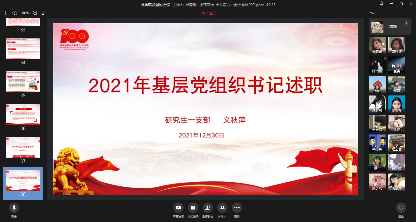 12月30日,必赢766net手机版研究生第一党支部12月理论学习暨党支部书记述职评议大会在明德楼1015会议室举行,支部全体党员通过线上加线下的方式参加了此次会议。